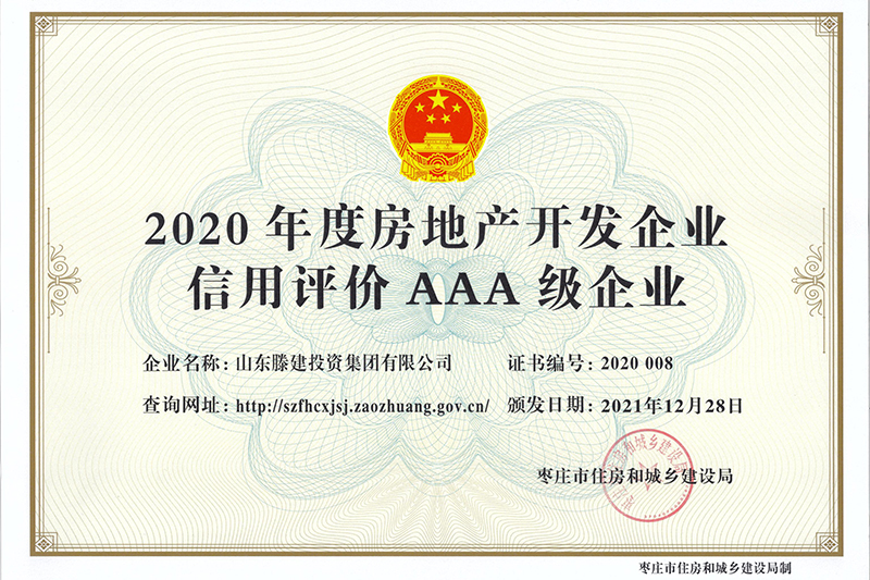 近期,枣庄市住房和城乡建设局发布了2020年度全市房地产开发企业信用等级评定结果。九游网有限公司凭借在企业客观信用能力、经营信用情况、社会信用等方面出色的综合实力,荣获2020年AAA级房地产开发企业最高信用等级。房地产开发企业信用评定是枣庄市住房和城乡建设局依据《枣庄市房地产开发企业信用评价实施细则