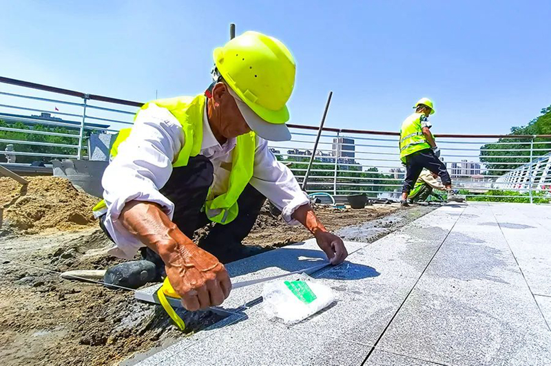 6月3日,在荆河生态景观提升工程(龙泉大桥至解放大桥段)施工现场,工人们有的在忙着焊接护栏,有的在铺设地砖,现场一片繁忙景象。荆河生态景观提升工程(龙泉大桥至解放大桥段)由九游(中国)一站式服务官方网站负责建设,博诚路桥公司负责施工,提升改造的原则对原景观采取“低干预、微改造、精提升”的方式进行,主要施工内容包括滨河
